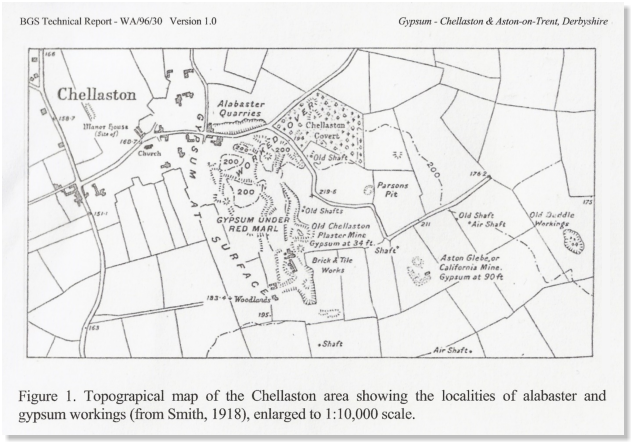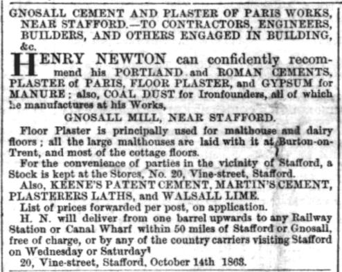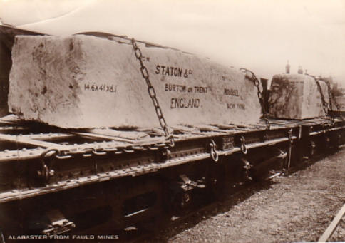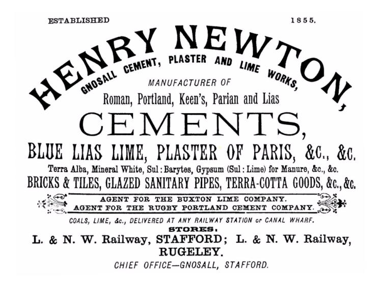 Geological and Technical notes.Introduction Henry Newton started his business in Gnosall in 1855. The earliest newspaper advertisement placed by him found so far is dated 1863. It gives an indication of variety of the building products that he was manufacturing at that time and is shown below:The following account gives a “base level” explanation of how the minerals and rocks that are used as raw materials were mined, transported and then processed in plaster and cement mills to manufacture those products.However, the account begins with a consideration of the local geology around Chellaston, near Derby (where the Newton family originated), and the Fauld area, near Tutbury, in East Staffordshire. These two areas are “famous” for their deposits of alabaster, as well as gypsum and anhydrite, the raw materials needed to make plasters and some types of cement. The manufacture of other types of cements that are derived from limestones such as Portland Cement are also covered.Geological SettingSome 180 - 190 million years or so ago, during the late Triassic period, Staffordshire was located at similar latitudes to the Sahara Desert. The climate was hot and arid, and the landscape was one of low hills, with sedimentary basins, wide flood plains and large shallow onshore ephemeral lakes, termed “Playa Lakes”.The basins were fed by rivers arising in once mountainous areas, to the south in France. The rivers transported clays, muds and silts (occasionally sands) as suspended sediments and deposited them into the basins. These sediments were lithified millions of years ago and became the thick sequences of reddish-brown coloured mudstones and shales found all across the Midlands, including Gnosall, where they are partly exposed in Cowley Cutting. The sequence is known as the Mercia Mudstone Group (MMG).In addition to the suspended sediment loads, rivers also carry minerals in solution, (dissolved out of the rocks over which they are flowing). Where the rivers drained into playa lakes (as opposed to the sea) because of the hot climatic conditions these lakes were susceptible to water loss by evaporation, and the consequent increase in concentration of dissolved minerals. At the saturation point, the minerals start come out of solution as precipitates and then sink to the bottom of the lake. Sometimes the playa lakes will dry up completely, creating “mineral flats” until river flows recover, and the lakes form again. These river and climatic conditions prevailed over millions of years and the process was repeated many times. Not surprisingly mineral deposits such as: Gypsum, Anhydrite and Alabaster formed in this way are collectively termed “Evaporites”. Within Staffordshire the most important deposits of Gypsum, Anhydrite and Alabaster are found around Tutbury and near a hamlet called Fauld in the Parish of Hanbury (there are others near Stowe by Chartley). Extensive deposits were also found in Chellaston, where Henry Newton was born, some 5 miles SE of Derby City Centre. The British Geological Survey now refer to all of the deposits (regardless of actual geographical location) as The Tutbury Gypsum in their “Lexicon of Named Rock Units”. The British Geological Survey Maps: Sheet 140 “Burton Upon Trent” covers Tutbury and Fauld areas and Sheet 141 “Loughborough” covers Chellaston. Both maps, together with vertical sections, cross-sections etc are available to view via the BGS Website’s. Map Portal.Evaporitic Minerals and Rocks GypsumGypsum is a naturally occurring, whitish, non-metallic mineral composed essentially of Calcium Sulphate. It also contains two molecules of water incorporated within its molecular structure (known as the Water of Crystallisation). The chemical formula is: CaSO4. 2H2O. In nature it can found in both crystalline and in massive forms. Gypsum is very soft and is easily scratched. It is designated as the Index Mineral Hardness 2 on Moh’s Scale of Hardness (where Talc = 1 and Diamond = 10). AnhydriteAnhydrite is a naturally occurring mineral very often found associated with gypsum. Like gypsum it is essentially Calcium Sulphate, but, as its name suggests, does not have any water of crystallisation. Its chemical formula is CaSO4. It tends to be greyish in colour but is harder than gypsum, registering 3 to 3.5 on the Moh’s Scale. AlabasterAlabaster is not a mineral per se, it is a rock composed a range of constituent minerals in varying amounts. The minerals include Gypsum, Anhydrite, Calcite (Calcium Carbonate, CaCO3) and traces of other minerals. It has a characteristic mottled and/or colour-banded appearance. It is a soft rock and can be carved, sculpted, turned on lathes and polished. It has been used for centuries to make ornate architectural features and “objets d’art”.Although gypsum, anhydrite and alabaster are classified as different substances, in evaporitic mineral deposits they are often found blended together in complex intermingled irregular bodies rather than individual distinct beds of pure gypsum or alabaster. Tutbury GypsumIn 1906 Thomas Trafford Wynne, an experienced Mining Engineer (Henry Newton’s son in law) presented a paper to the Institution of Mining Engineers titled “Gypsum in the Dove Valley”, where he described the nature of the Tutbury Gypsum deposits. Extracts as follows:The gypsum is found cropping out on the hillside and has proved to be a continuous though irregular deposit, though how far back into the hill has not yet been ascertained... All classes of stone are mined: large alabaster blocks, either pure white or veined or coloured; and from the best white gypsum from which the highest grades of plaster are made, through the various grades down to stone so mixed with marl as to be valueless.Anhydrite, or as it is called locally “hardstone”, is met with in varying quantities…There seems to be no dividing line or clear cleavage between the gypsum and the anhydrite. The hardstone is often inti