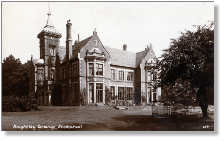 The site of Knightley Grange was owned on the Tithe survey in the late 1830s by the Earl of Lichfield. In August 1856 an estate of 2000 acres was advertised for sale by auction in September of that year (see newspaper article). It was described as “a highly valuable freehold estate situate in the townships of Norbury, Knightley, Plardiwick and Gnosall”. The sale particulars (Stafford Record Office D615/ES/4/12) advertised several farms together in one lot. The land sold to Mr Hargreaves amounted to about 580 acres. This is calculated from the land owned by his son’s widow Rose Hargreaves on the 1910 Finance Act (see plan), and which confirms the 1856 Sales particulars held at Stafford Record Office, so it appears that the original 2000 acres sale was divided and it is not clear whether his purchase was concluded at the auction or at a later date. The site for the building of Knightley Grange property was on that of Cob Hall Farm (plot 417 on Tithe Map). A relevant section of the 1838 Tithe map and later OS map from 1880 have been merged in the comparison (shown by the link on the right). Note the the orientation of the Tithe map is not North-South as indicated by the angle of the 1838 text. As can be seen in the comparison the adjacent roadway was changed and a sweeping driveway laid to the west side with a service access to the east. Cob Hall Farm comprised 105a, 0r, 7p perches of land in 1856 and was in the tenancy of John Skellorn. Skellorn’s tenancy of Cob Hall Farm was recorded in the Gnosall rate books maintained by parish overseers of the poor. Details show that in April 1860 the owner was Earl of Lichfield and a few months later in August, the owner was Hargreaves. However, the land area had reduced to 97a, 2r, 4p on both records. Maybe Hargreaves had made an arrangement to occupy some of the estate earlier or until Skellorn’s tenancy had expired thus allowing building work to commence. In January 1861, the Gnosall rate books indicate that Hargreaves is the occupier as well as the owner. There are no dates when the Grange was built but what may help is to track the whereabouts at that time of Robert Hargreaves. He was residing in the late 1840s at Johnson Hall just South of Eccleshall and it is from that address it is assumed he negotiated the purchase of the estate from Earl of Lichfield. Newspaper articles (shown by the link on the right) from 1859 show that he was at the Hall in July. Johnson Hall was sold in August and there was a 3 day sale of contents in September “the property of Robert Hargreaves Esq”. Some 12 months later on 16 December 1860 his son Robert Halstead Hargreaves was born at Leamington Priors, Warwickshire. The newspaper announcement refers the father as Captain Hargreaves, Norbury Manor. So it appears that the family might have moved to Norbury Manor which was included in the estate that Hargreaves purchased. However, The 36, Lansdown Place, Leamington Priors address is a mystery. Robert Halsted was christened at Leamington Priors in February 1861 and the whole family was there on the 1861 census. In June 1861 Robert was back in the locality attending a dinner at Walton Grove, Eccleshall of the “Eccleshall Rifle Volunteers” where the chairman in his speech said: “it gave him great pleasure to see Major Hargreave’s face once more amongst them, and he hoped that ere long he would settle in his new home as one of the resident landed proprietors of the county”. The earliest evidence of occupancy was a newspaper report dated 25 January 1862 of a ball. A list of patrons included “Major Hargreave, Knightley Grange, Eccleshall”. He built his imposing country house “in the Tudor style”, Knightley Grange. The original house had tall Tudor chimneys, a tower, mullioned windows and projecting bay windows topped by balconies. The property remained in the Hargreaves family for over 100 years until it was sold with most of the estate in 1967. Some properties were retained by the family. Knightley Grange was never lived in again after that date. 1967 - It was bought by a farmer Brian J Dale from Ludlow who demolished the tower as it was unsafe and started work doing structural alterations, but these were never completed. In 1992 Knightley Grange and the majority of the estate was sold to Lichfield Estates who didn’t do anything to it. Then in 2007 it was bought by a large property investment company Granger PLC. In 2009 they sold it to the present owner. At that time, Country Life magazine wrote: “Uninhabited now for a number of years, Knightley Grange is in a pretty rundown state, although wind- and weathertight, and according to selling agent Tony Morris-Eyton, wired and plumbed to ‘first fix stage’. Shrewsbury-based architect Graham Moss has produced an impressive set of drawings indicating how the house and its courtyard of ancillary buildings could look once restored. It makes an appealing picture, at an estimated construction cost of £1m-plus.” The building was demolished in 2019.
