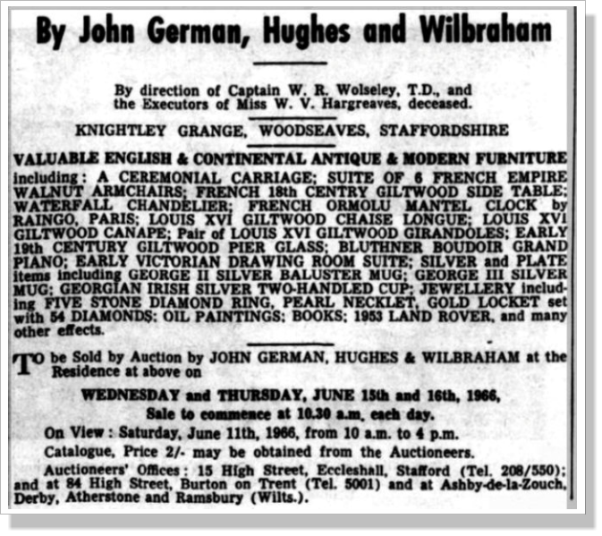 The only in-house servant mentioned on the 1871 census was a nurse for the three children. Mrs Hargreaves had advertised in 1864 for “a NURSEMAID, who thoroughly understands her duties and is a good needlewoman”. Major Hargreaves advertised in 1872 for “a thoroughly competent IN-DOOR SERVANT, unmarried, for a single-handed place. In livery preferred.— Address, stating age, height, wages, and experience, to R. Hargreaves, Esq., Knightley Grange.” In 1881, when widowed Sarah Ann was living there with daughter Elizabeth (with the Rev. Till’s daughter visiting), the census listed a cook, a butler, a housemaid and a kitchenmaid. By 1891, Robert and Rose were living at the Grange, and the in-house staff had risen to eight; a housekeeper, two housemaids, a kitchen maid, a butler, a groom, a nurse and an under-nurse. The gamekeeper, coachman and gardener lived nearby. (Sadly, the gamekeeper, George Slynn, died in a gun accident in 1907.) In 1896 Rose advertised in the Morning Post for an under nurse “French or French-Swiss, Protestant, age 15, clean and active, very good character required”. From the other advertisements, it seems it was the thing to have French or French- Swiss maids. German maids were also in demand. This was presumably so that the children would acquire good French or German accents. In 1899 she advertised: “WANTED, Good KITCHENMAID; age 20-22; Churchwoman; country situation; dairy and baking; scullerymaid kept : very good character required.” The Grange staff had changed slightly by 1901: housekeeper, lady’s maid, children’s maid, two housemaids, kitchen maid, footman and groom. Things had changed by 1924 when the family advertised for a “Youth (18) … for Pantry and to Clean Motors.” Again age, height and experience were requested. The Hargreaves also advertised to tried to find places for their staff. In 1890 “Miss Hargreaves of Knightley Grange” advertised to recommend a 16-year-old boy as “Page or Hall Boy,” and on Sarah Ann’s death in 1895, Mrs (Rose) Hargreaves advertised in the Morning Post on behalf of the maid who had looked after her mother-in-law: “MRS. HARGREAVES wishes to RECOMMEND a Good MAID for middle-aged or elderly lady ; suitable to an invalid, kind, and attentive; good needlewoman; Church of England; age 33; wages £28-£30; leaving only through death.— Knightley Grange, Eccleshall, Staffs.” (This may have been Elizabeth Loyns.)