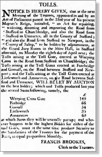 In April 1795 the Clerk to the Trustees, Francis Brookes (a Stafford solicitor) put an announcement in the Staffordshire